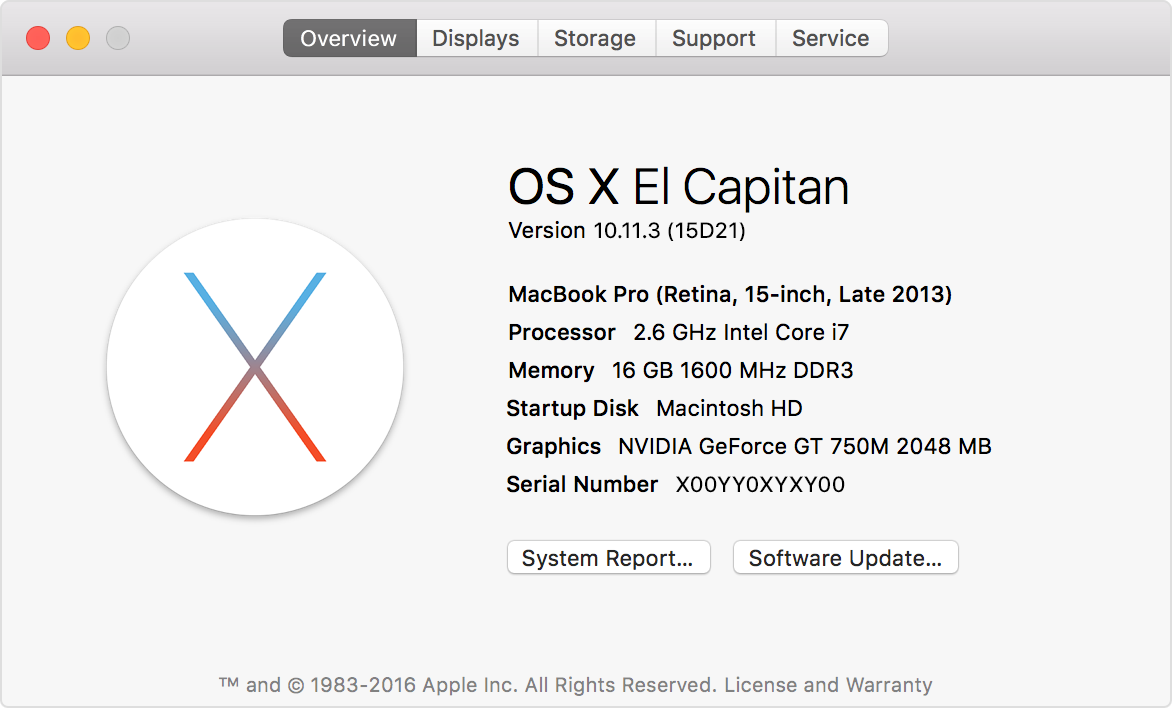 Choose About This Mac from the Apple menu in the upper-left corner of your screen. About this mac show an overview of your Macbook Pro, including the name and version of its operating system, its model name, and its serial number.
